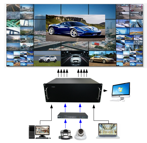 外置拼接解碼處理器(H.265)是專門為同時(shí)接入處理網(wǎng)絡(luò)攝像機(jī)(IPC)和外部源輸入信號(hào)(HDMI,DVI,VGA等)而設(shè)計(jì),采用最新的專用圖像解碼芯片與FPGA搭配,通過專用圖像解碼芯片解碼網(wǎng)絡(luò)攝像機(jī)的信號(hào),然后再和通過FPGA接入的外部源輸入信號(hào)混合處理,實(shí)現(xiàn)圖像切換,拼接,開窗,漫游等功能,是目前解決網(wǎng)絡(luò)攝像機(jī)